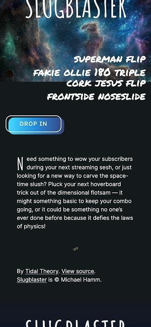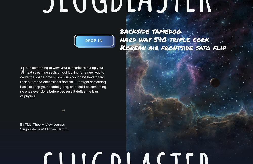 A fun little tool for a friend’s sci-fi tabletop RPG. Mashes up skateboard, snowboard, and surfing terms into real-sounding (often physically impossible) trick names for players. Of course, being boarding culture–adjacent, I had to reference David Carson for the design.